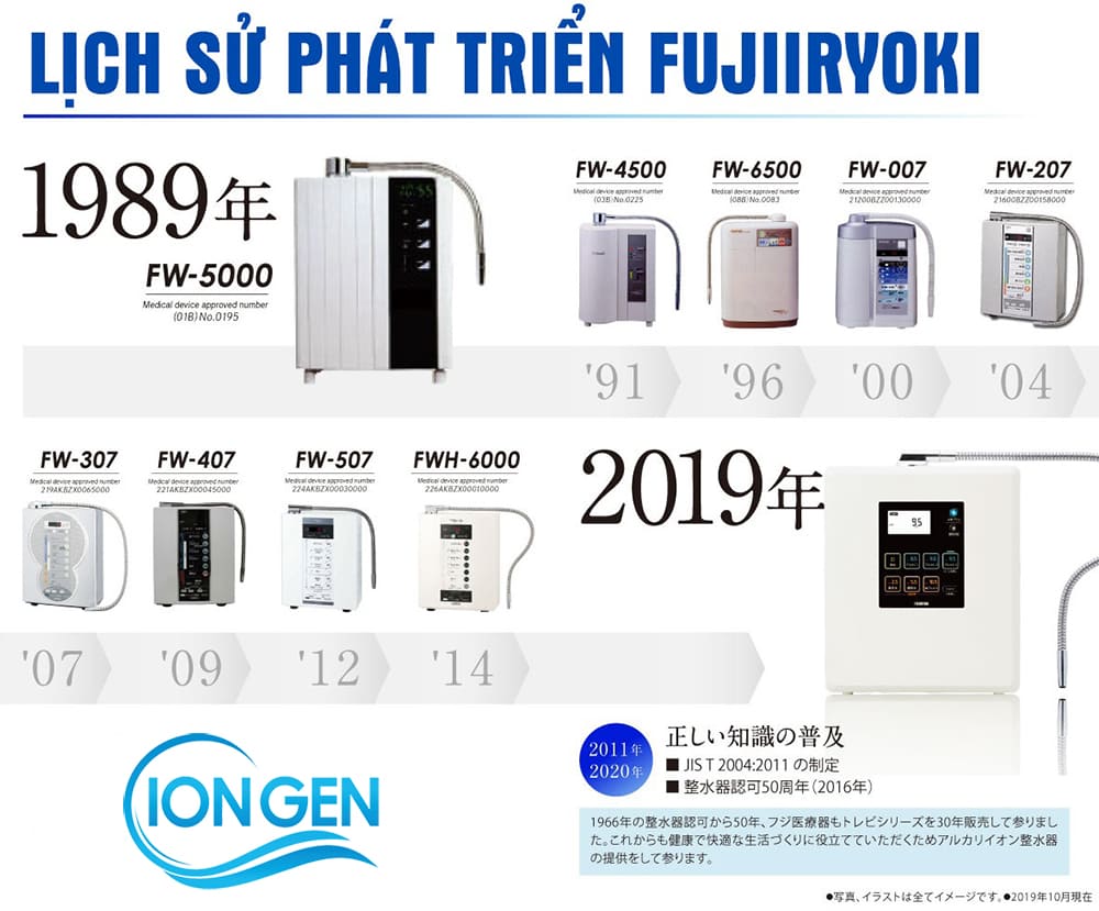 Máy Lọc Nước Ion Kiềm Fujiiryoki Trevi bắt đầu lịch sử của mình với việc sản xuất thiết bị chăm sóc sức khỏe vào năm 1954. Và sau đó đã phát triển các dòng máy lọc nước ion kiềm từ năm 1989.