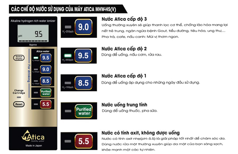 Atica cho phép ra nước ion kiềm có độ pH từ 5.5 đến 9.5, với đọaan pH này thì cực kì an toàn cho người dùng. Theo các chuyên gia. Nếu mức độ pH trên 10 là nước siêu kiềm, chuyên dùng để rửa rau củ và thực phẩm trước khi dùng. Nó sẽ giúp cho bạn khử được các thuốc diệt trùng, diệt cỏ bám trên rau củ, làm cho thực phẩm tươi mới.