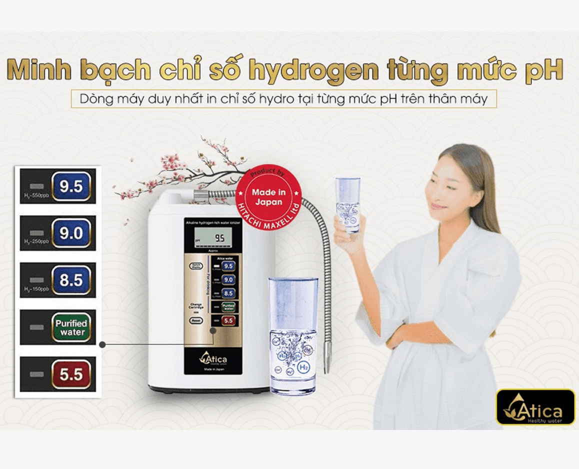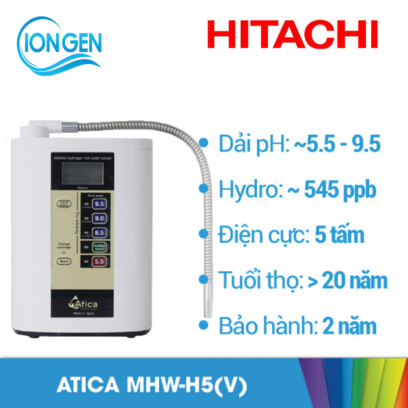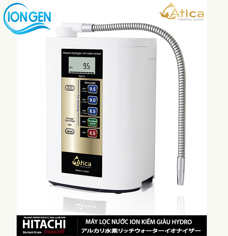 Atica MHW-H5(V) là dòng máy lọc nước sạch và tạo nước ion kiềm giàu hydro cao cấp trong lĩnh vực máy nước điện giải. Là dòng máy thế hệ mới được sản xuát bởi tập đoàn Hitachi Maxell và được quản lý bởi hiệp hội ion kiềm Nhật Bản. Có thể tạo được nước ion kiềm với dải pH rộng từ 5.5 đến 9.5 phù hợp với các nhu cầu khác nhau của con người. Nhằm cung cấp nước ion giàu hydro tốt cho sức khỏe và dùng điều trị các bệnh mãn tính. Hiện máy được lưu hành trên toàn thế giới và được các bệnh viện lớn tin dùng.